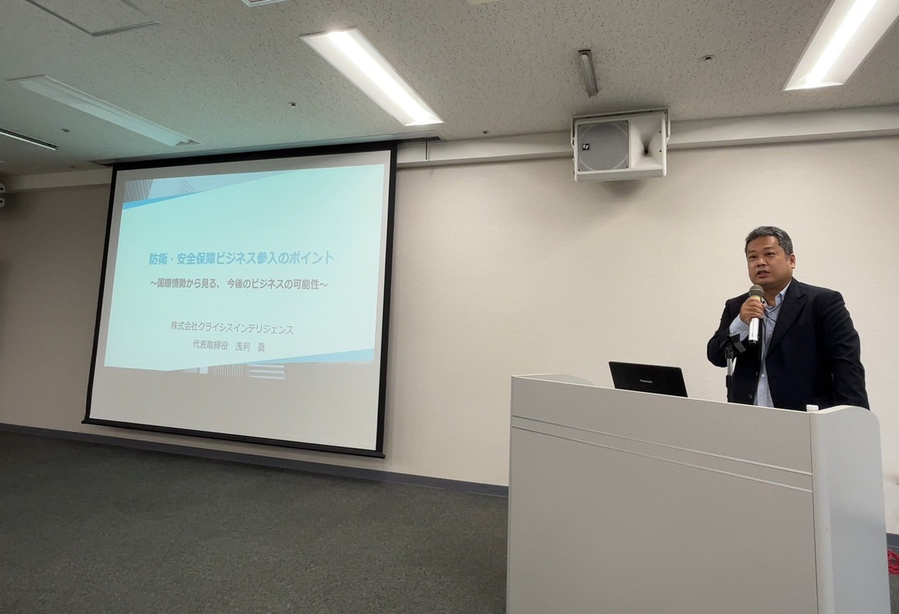 浅利は「安全保障ビジネスイベント主催者からみる安全保障ビジネスの現状と展望」と題し、